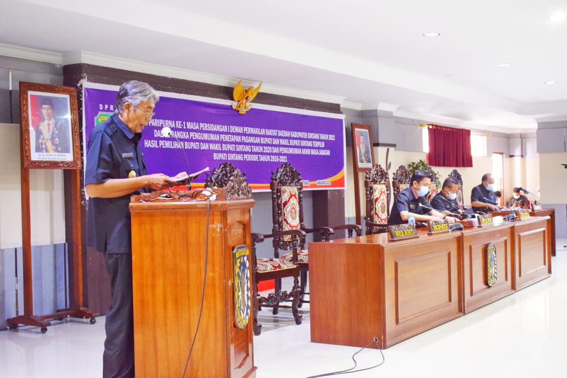SINTANG, RS – Dihadapan pimpinan dan Anggota DPRD Sintang, Forkopimda, dan Kepala Organisasi Perangkat Daerah di Lingkungan Pemerintah Kabupaten Sintang, Bupati Sintang, Jarot Winarno, memohon pamit kepada seluruh masyarakat Kabupaten Sintang diujung pengabdian masa jabatan Bupati Sintang dan Wakil Bupati Sintang periode 2016-2021.